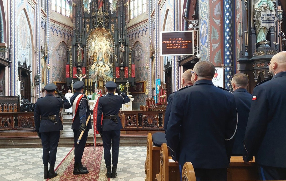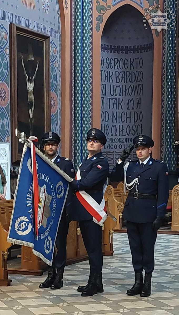 Podniosłą atmosferę wydarzenia dodatkowo podkreśliła obecność pocztu sztandarowego Komendy Miejskiej Policji w Dąbrowie Górniczej, który wprowadzono do świątyni w asyście funkcjonariuszy pełniących służbę reprezentacyjną.