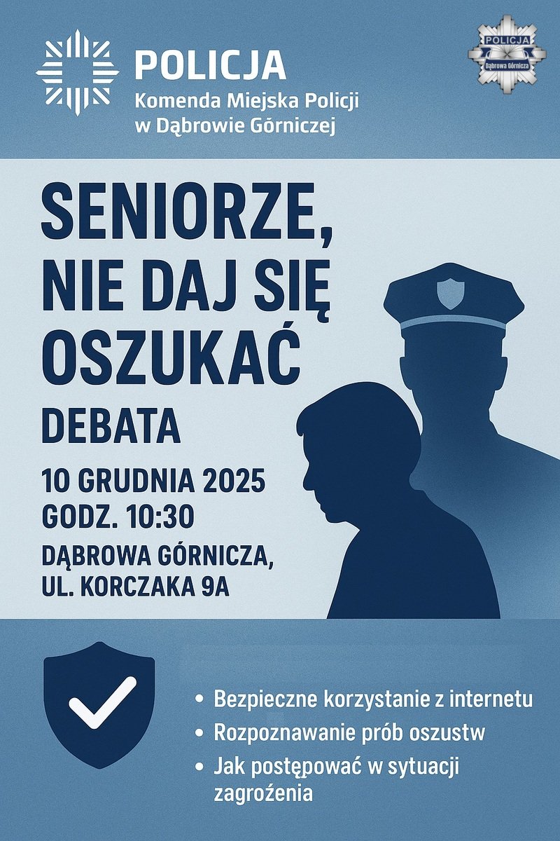 Serdecznie zapraszamy na debatę społeczną pod tytułem „Seniorze – nie daj się oszukać”, prowadzoną przez ekspertów z Komendy Miejskiej Policji w Dąbrowie Górniczej.